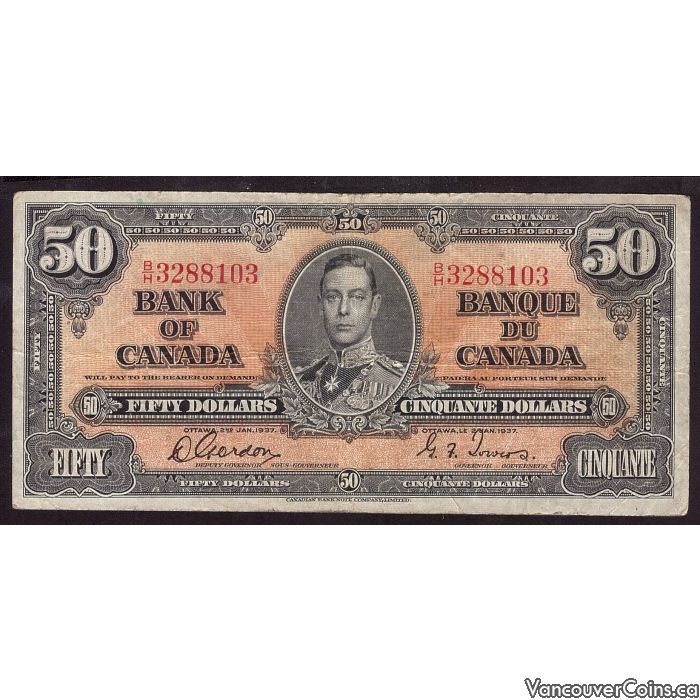 1937 Canada $50 banknote Gordon Towers B/H3288103 nice FINE+