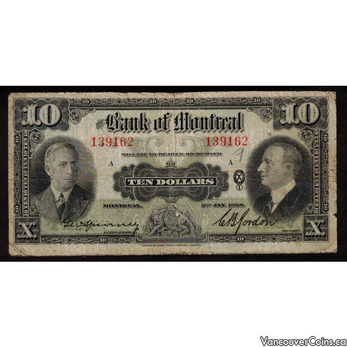 1938 Bank of Montreal $10 Spinney Jordan 139162 VG