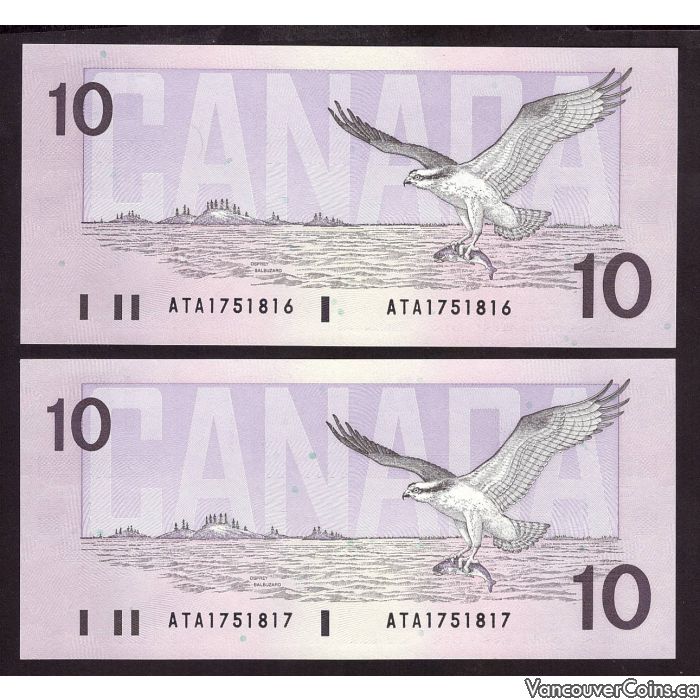 2x 1989 Canada $10 consecutive notes Theissen Crow ATA1751816-17 CH UNC