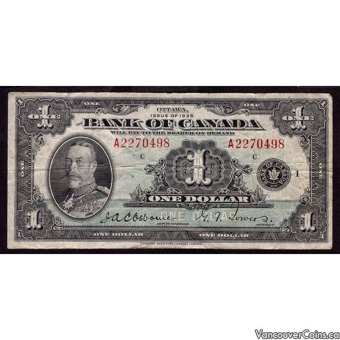 1935 Canada $1 banknote Osborne Towers A2270498 a/VF
