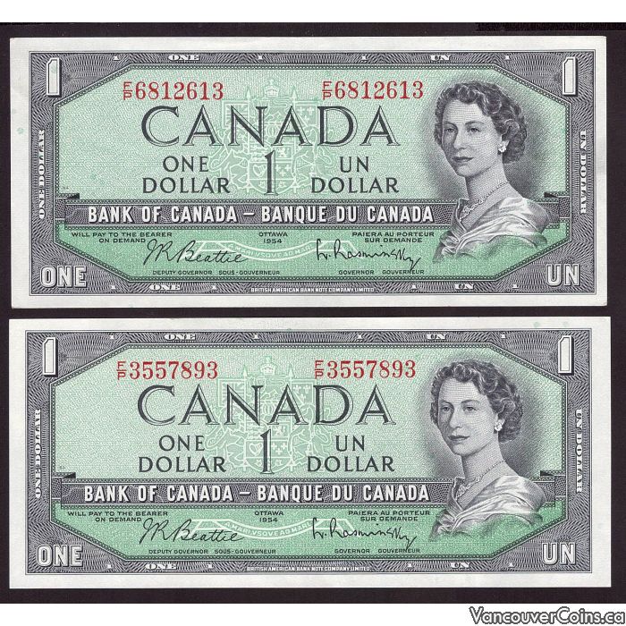 2x 1954 Canada $1 banknotes Beattie Rasminsky F/P3557893 F/P6812613 EF/AU