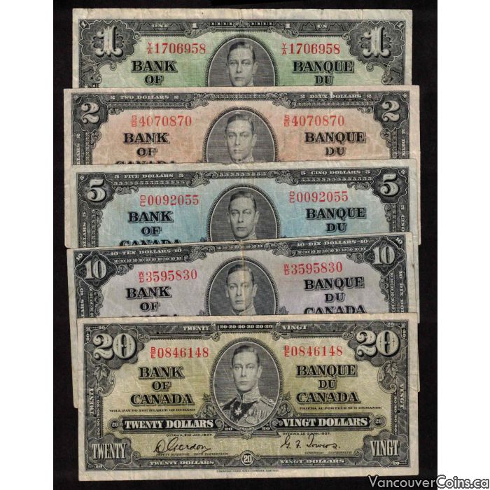 1937 Canada $1 $2 $5 $10 $20 banknote set all Gordon Towers FINE