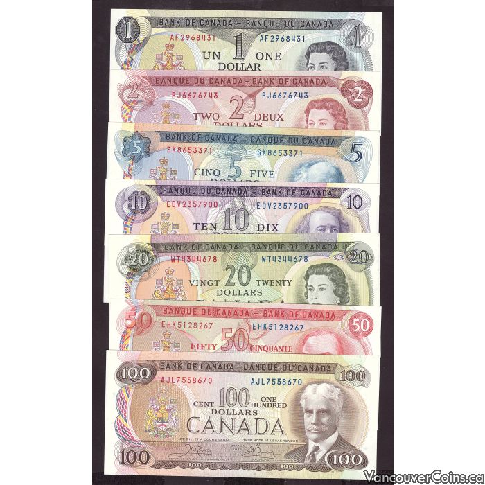 1969-1975 Canada banknote set $1 $2 $5 $10 $20 $50 $100 7-notes CH UNC+