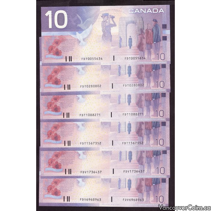 6x 2000 Canada $10 notes Knight Theissen 4xFDT 2xFDV Choice UNC