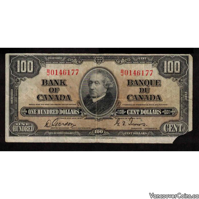 1937 Canada $100 banknote Gordon Towers B/J0146177 F missing corner
