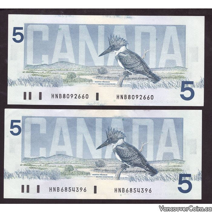 2X 1986 Canada $5 banknotes BC-56e HNB6854396 and HNB8092660 Choice UNC