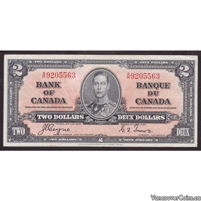 1937 Canada $2 banknote Coyne Towers A/R9205563 EF+