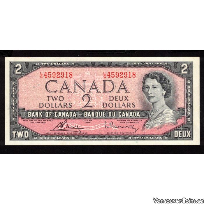 1954 Canada $2 banknote Bouey Rasminsky L/G 4592918 Choice AU/UNC Choice