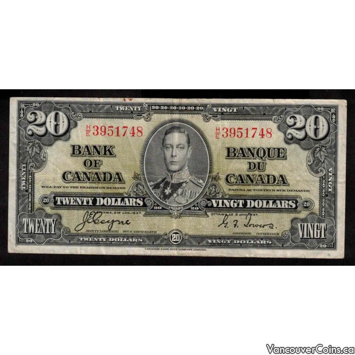 1937 Canada $20 banknote Coyne Towers H/E 3951748 FINE+