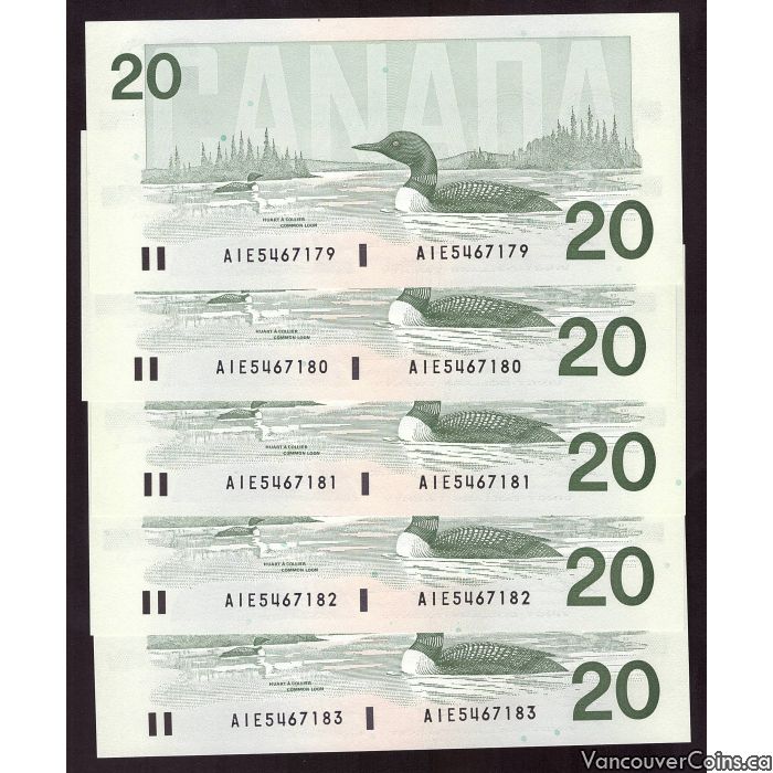 5x 1991 Canada $20 banknotes Theissen Crow AIE5467179-83 GEM UNC EPQ