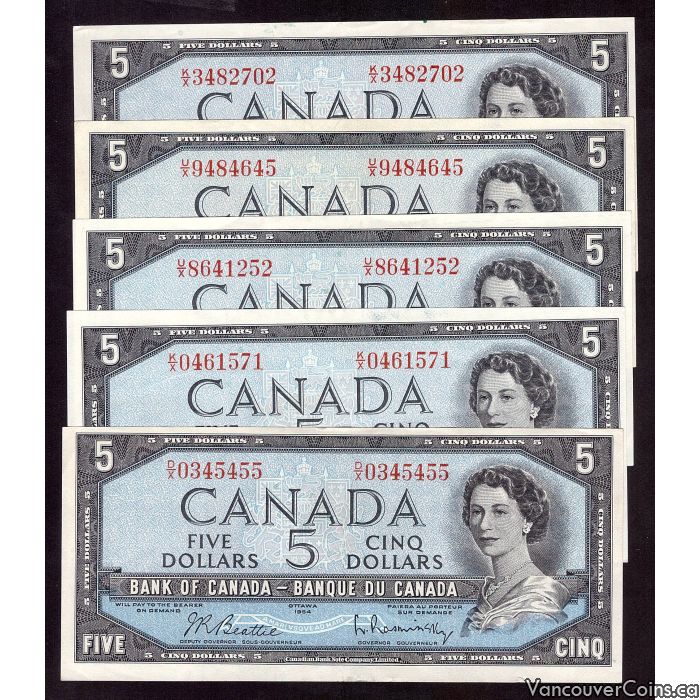 5x 1954 Canada $5 bank notes 5-notes EF or better