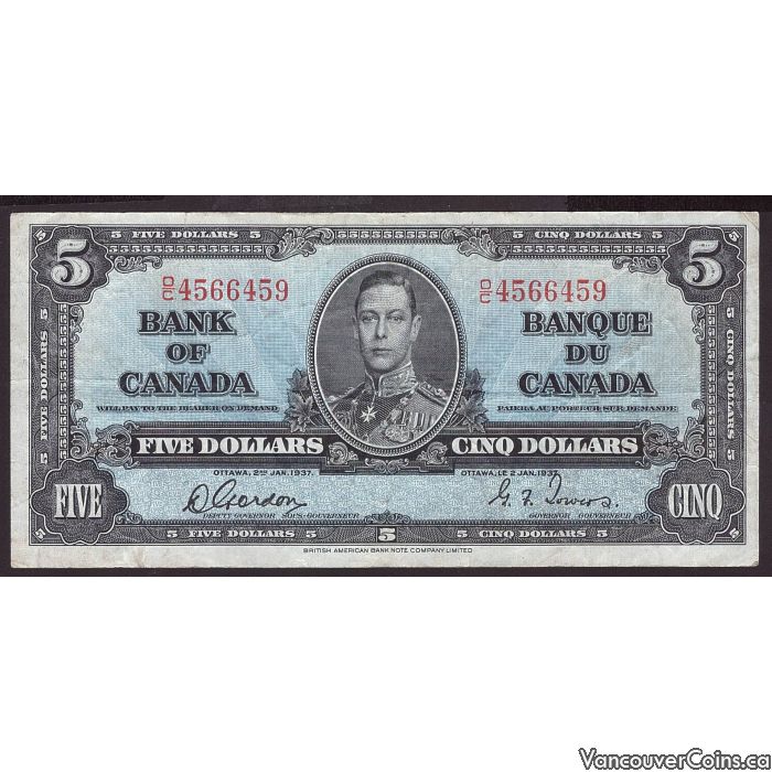 1937 Canada $5 banknote Gordon Towers O/C4566459 VF
