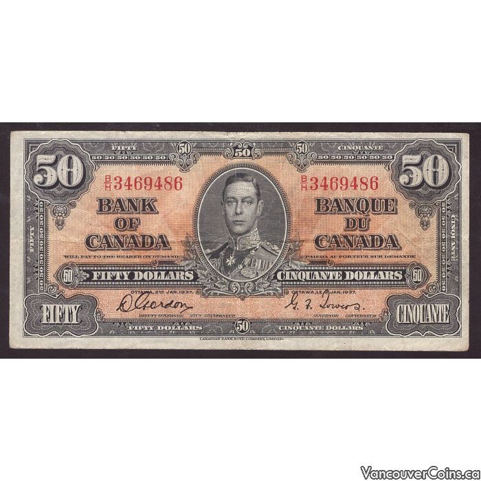 1937 Canada $50 banknote Gordon Towers B/H3469486 nice VF