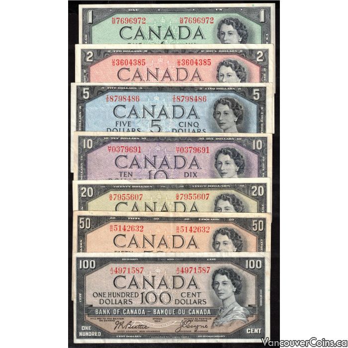 1954 Canada $1 $2 $5 $10 $20 $50 $100 banknote set 7-notes a/EF to AU+