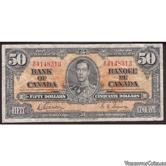 1937 Canada $50 banknote Gordon Towers B/H4148313 F+