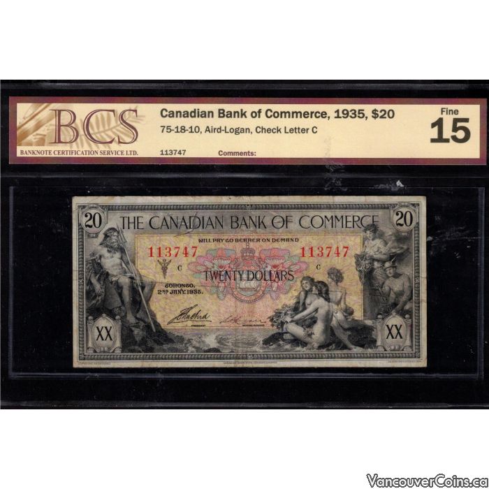 1935 Canadian Bank of Commerce $20 note Aird Logan SN113747 C BCS-F15