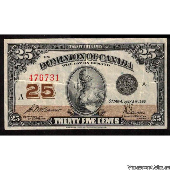1923 Canada 25 Cent banknote McCavour Saunders 476731 DC-25c VF+
