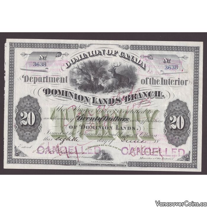 1876 Dominion of Canada $20 Land Scrip Metis No 3638