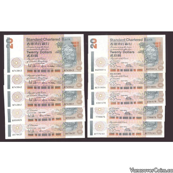 10x 1992-95 Hong Kong Standard Chartered Bank $20 notes