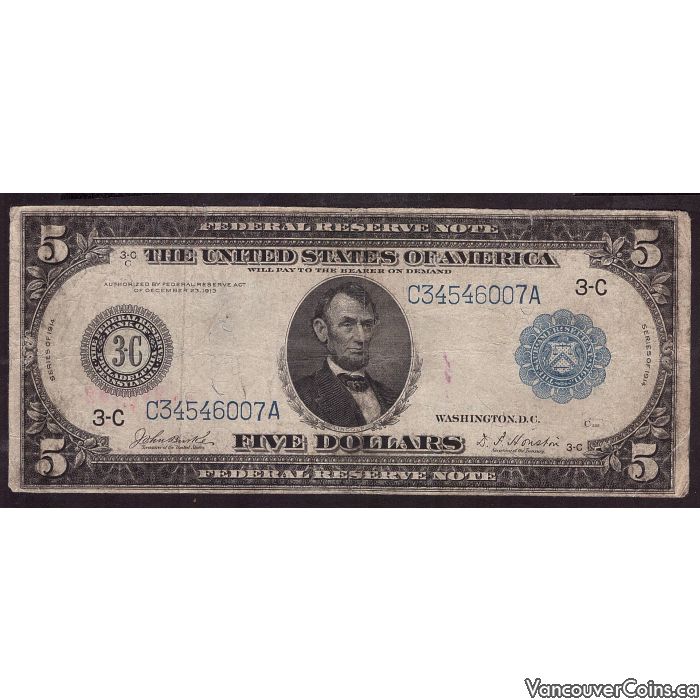 1914 $5 Philadelphia Federal Reserve Note 3C Burke Houston C34546007A a/VF