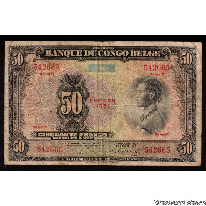 1951 Belgian Congo 50 francs banknote serial # 542665 no holes no tears VG/F