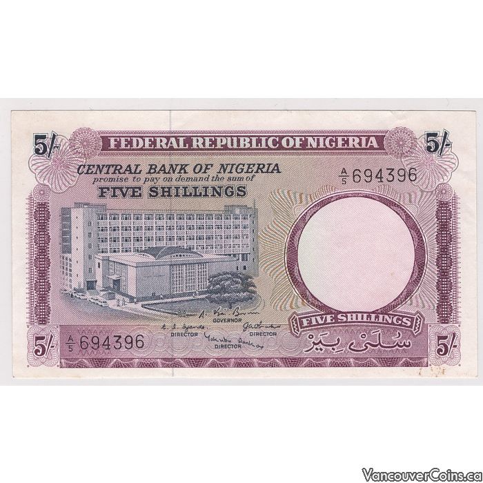 Nigeria 5 Shillings (1967) KR #6 AU-50 Catalog $100.
