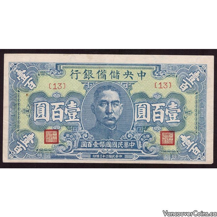 China Central Reserve Bank 100 Yuan 1944 (13) light blue P#J29 EF