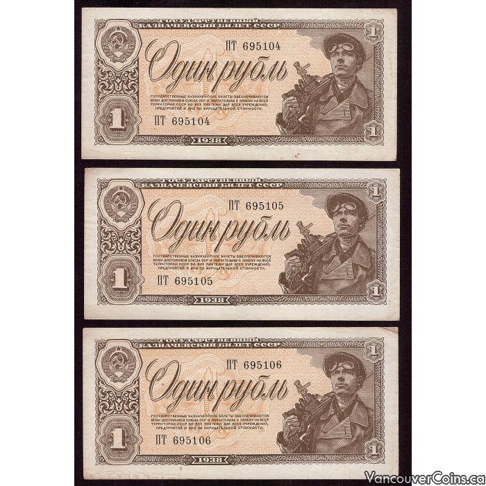 Russia USSR Treasury 1938 3-consecutive banknotes EF/AU