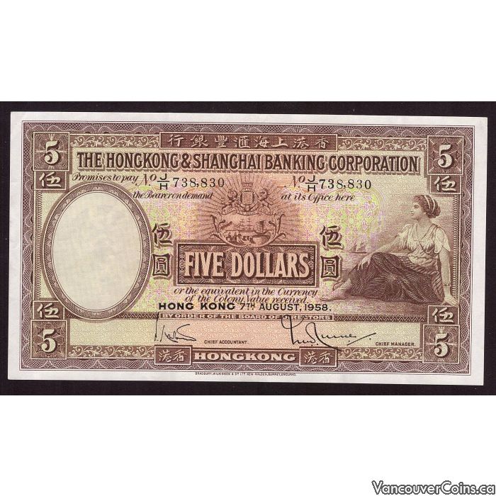 1958 Hong Kong Shanghai Banking Corp FIVE DOLLARS $5 banknote EF45 EPQ