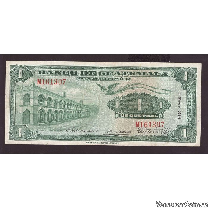 1954 Banco De Guatemala One 1 Quetzal banknote VF20