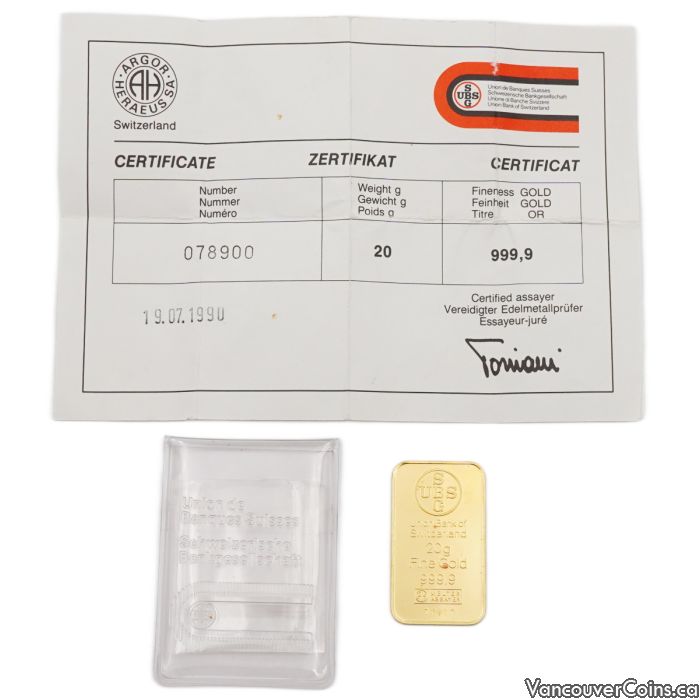 1990 UBS 20g Gold Bar – 999.9 Fine Gold – Union Bank of Switzerland with COA and Assay Sleeve