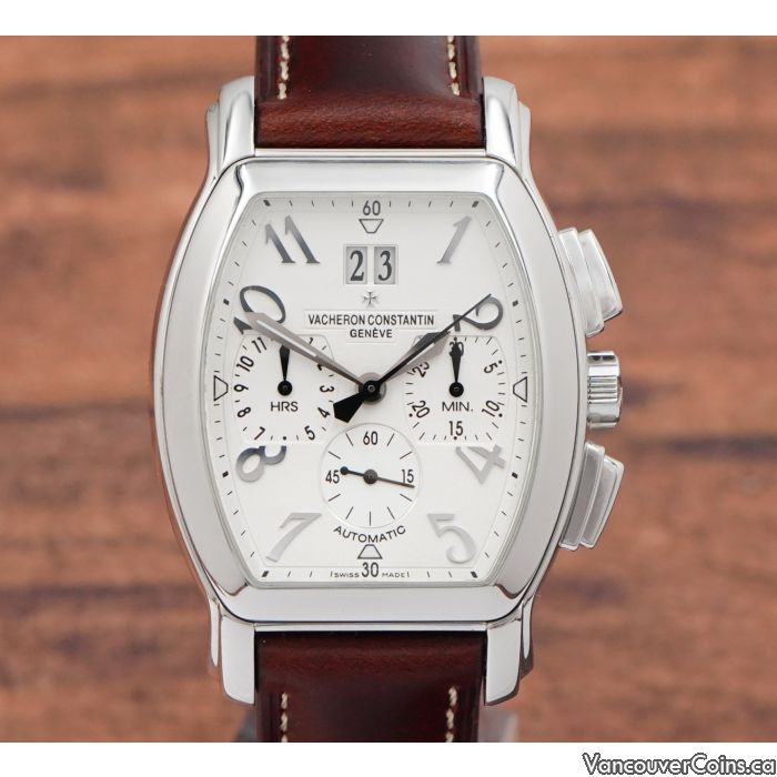 Powered by the renowned Caliber 1137 automatic movement, this chronograph offers precision and reliability. The watch is paired with a brown leather strap and a stainless steel deployant buckle, adding elegance to its sporty design. This timepiece comes complete with its original Vacheron Constantin box and papers, ensuring authenticity and provenance.