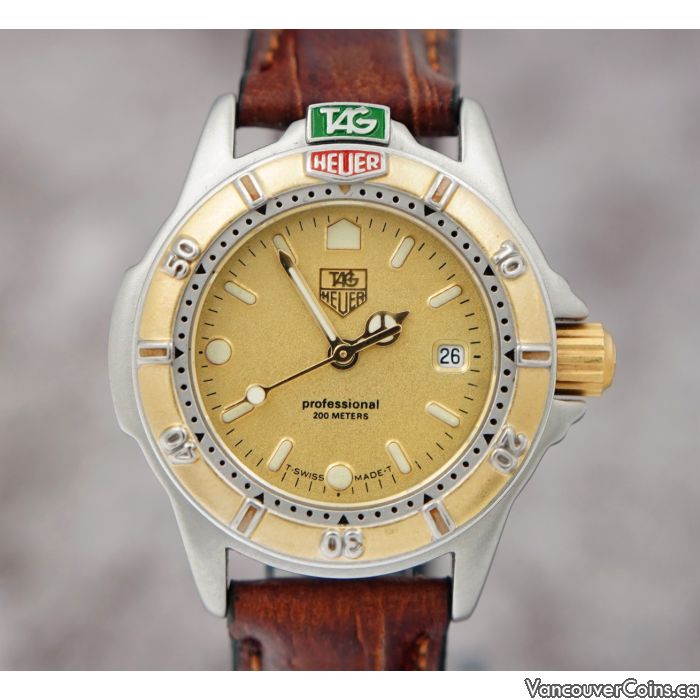 This vintage pre-owned TAG Heuer Professional 200 Ref. 995.408A is a refined women’s watch powered by a reliable Swiss-made quartz movement. The 28mm stainless steel case houses a luxurious gold dial with a date window at 3 o’clock, offering a timeless and elegant aesthetic. The watch is running and keeping great time, mounted on an aftermarket brown leather strap for a versatile look. It shows minimal wear, consistent with its age, and is fully functional. No box or papers are included.