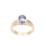 One ladies' yellow gold solitaire ring of classic design acid tested at 14 karat gold purity. The ring consists of a domed and polished shank which extends from the shoulders to a four claw setting with collet base and cross over bridge. The setting secures a faceted sapphire described in detail as follows.