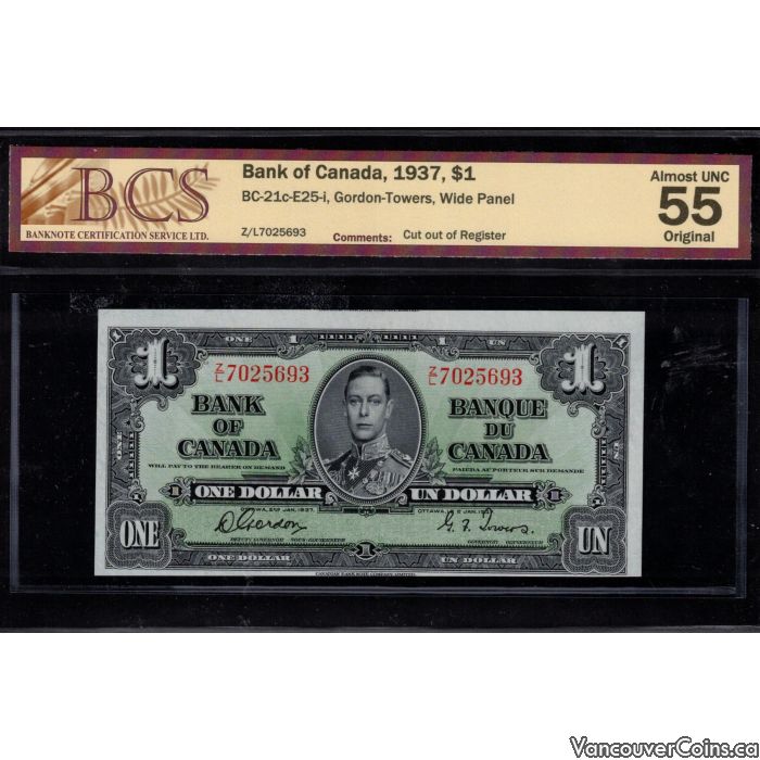 1937 Canada $1 dollar Error note BC-21c-E25-i Miscut next note shows BCS AU5