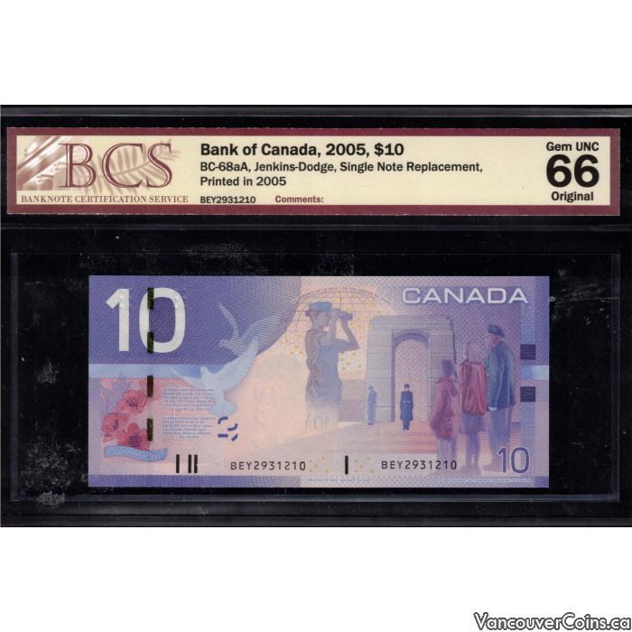 2005 Canada $10 replacement note Jenkins Dodge BEY2931210 BCS GEM UNC-66