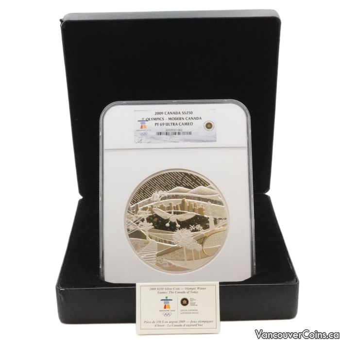 This stunning 2009 Royal Canadian Mint $250 proof silver kilogram coin celebrates "Modern Canada" for the Vancouver 2010 Olympic Winter Games, graded PF69 Ultra Cameo by NGC with attractive light toning. Struck in 1,000 grams (32.15 troy oz) of 99.99% pure silver, it features ultra-high relief design by the Vancouver Organizing Committee depicting contemporary West Coast Canada scenes including cityscapes, birds, paths, and mountains. Housed in an NGC holder, original black RCM box customized to fit the NGC holder, and original COA, no outer sleeve