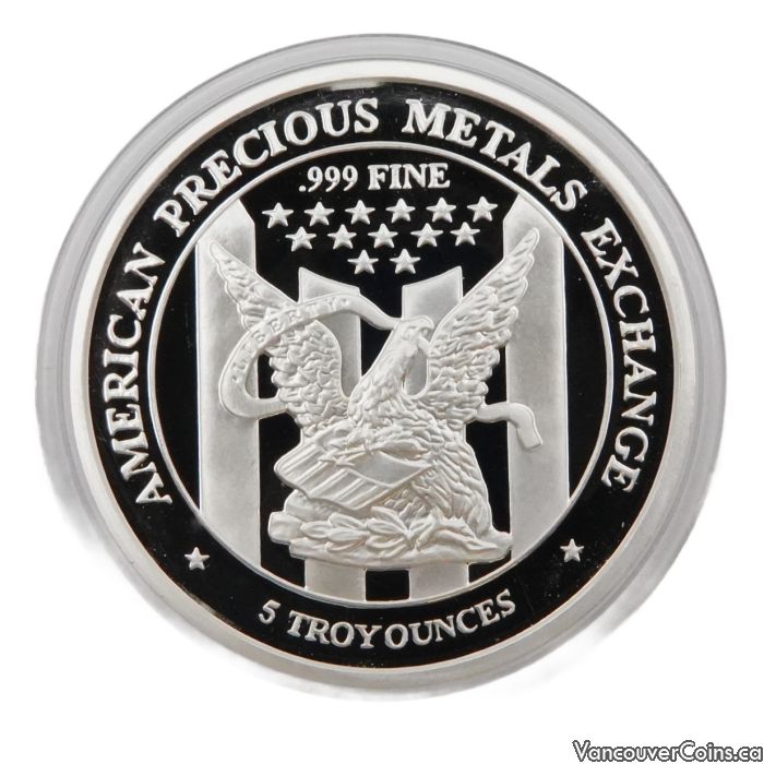 - Reverse features bold "APMEX" logo, "AMERICAN PRECIOUS METALS EXCHANGE www.apmex.com," and ".9999 FINE SILVER 5 TROY OUNCES."