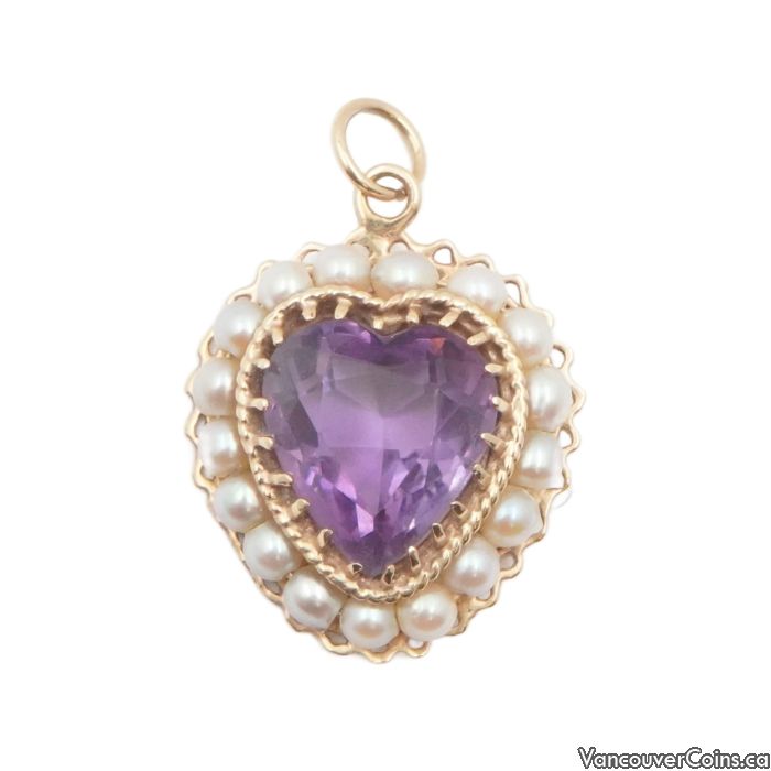 14K Yellow Gold Heart Pendant, Amethyst & Cultured Pearl, 4.48g, Vintage Estate